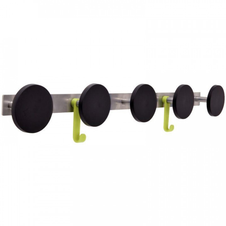 Portemanteau 5 patères plastiques + 2 crochets diamètre 9cm noir. Très lisse, grand diamétre (9cm) pour une parfaite accroche et un respect maximal de vos vêtements. Finition en époxy gris aluminium.L 81cm x H 9cm x P 7cm.