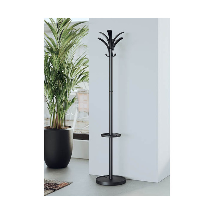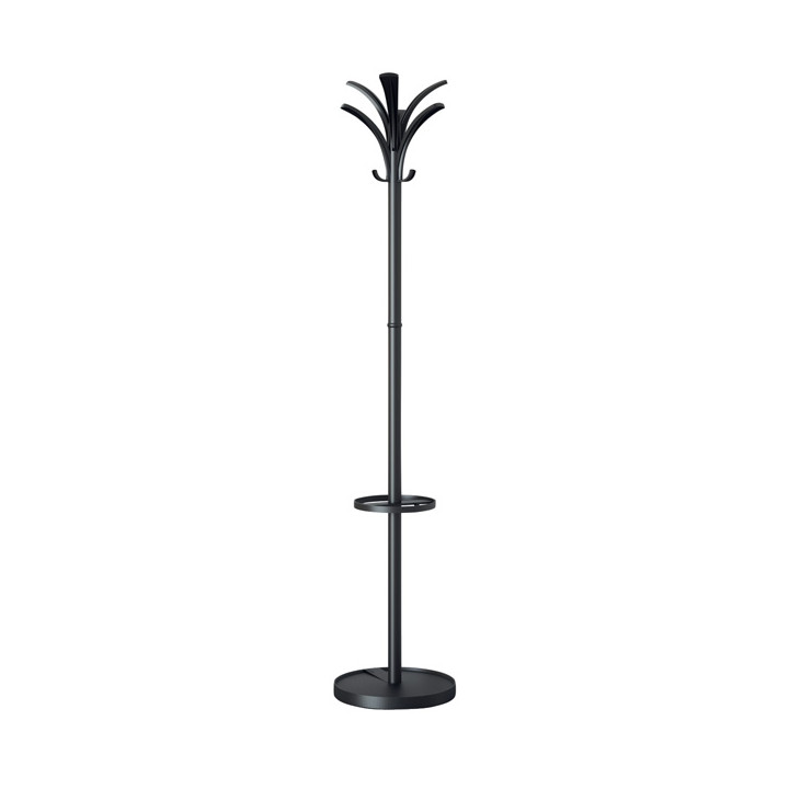 Porte manteau Brio noir. En acier 6 grandes patères, tête rotative, 3 petits crochets pour les sacs. Porte-parapluie (capacité: 6 parapluies). Socle de rétention d'eau lesté. Montage rapide en 5 minutes. Dim: Ø socle 35.5cm x H175cm. Poids 7.2kg Garantie 2 ans.