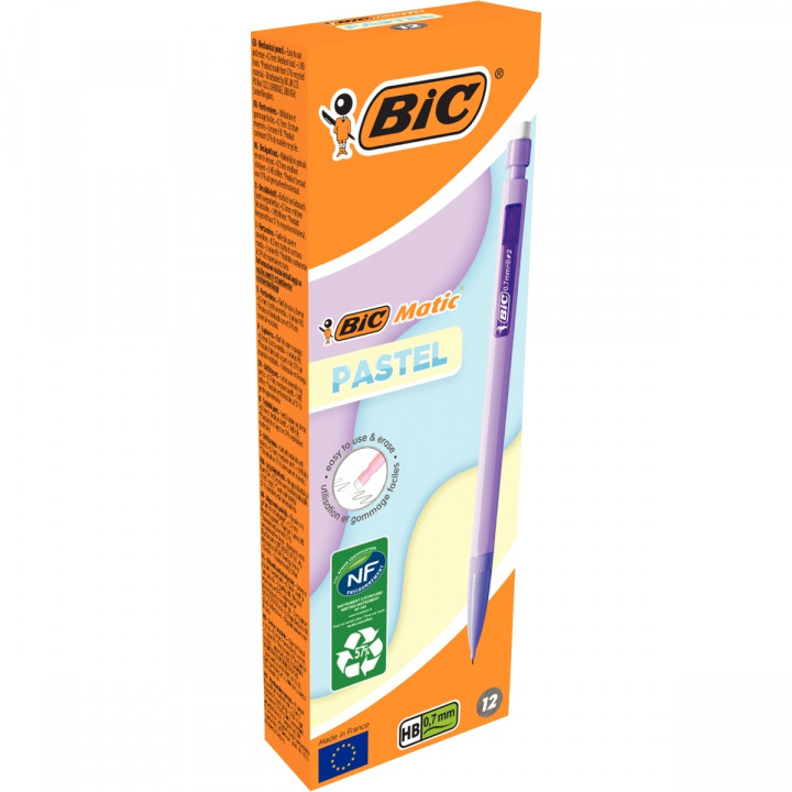 Boîte de 12 portemines Matic pastel 0,7mm assortis. Corps de couleur contenant 3 mines HB de 90mm. Embout gomme. Différentes couleurs dans la boîtes (x2 violet, x3 rose x3 bleu, x2 vert et x2 lilas)