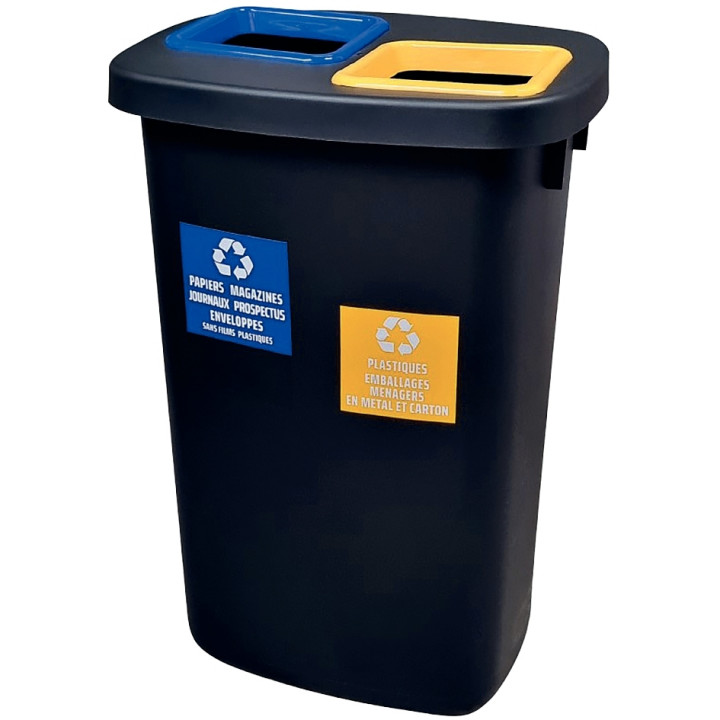Poubelle ATRIUM DUO 2x45L + 2 clips et 2 étiquettes . USAGES ET PROPRIETES : Kit de tri sélectif permettant de faire sa propre combinaison de tri, composé de : • 1 base plastique rectangulaire • 2 poubelles amovibles de 45L chacune • 1 couvercle avec 2 trous pouvant accueillir 2 clips • Poubelle livrée avec 2 clips couleurs et 2 étiquettes de tri à choisir selon la configuration souhaitée. ? Design contemporain et fonctionnel ? Conception robuste sans mécanisme fragile ? Hygiénique car sans contact avec la poubelle grâce au couvercle à ouverture centrale ? Fabriquée à partir de plastiques recyclés ? Nettoyage facile ? Fabriquée en Europe ? Poubelle équipé de 2 arceaux métallique qui permettent de fixer le sac poubelle sans débordement extérieur CARACTERISTIQUES : Composition : Polypropylène recyclé Dimensions poubelle 45L : 74 x 35,5 x 22,5 cm Dimensions base : 74 x 51,5 x 39,5 cm Capacité poubelle : 90L (2 poubelles de 45L)