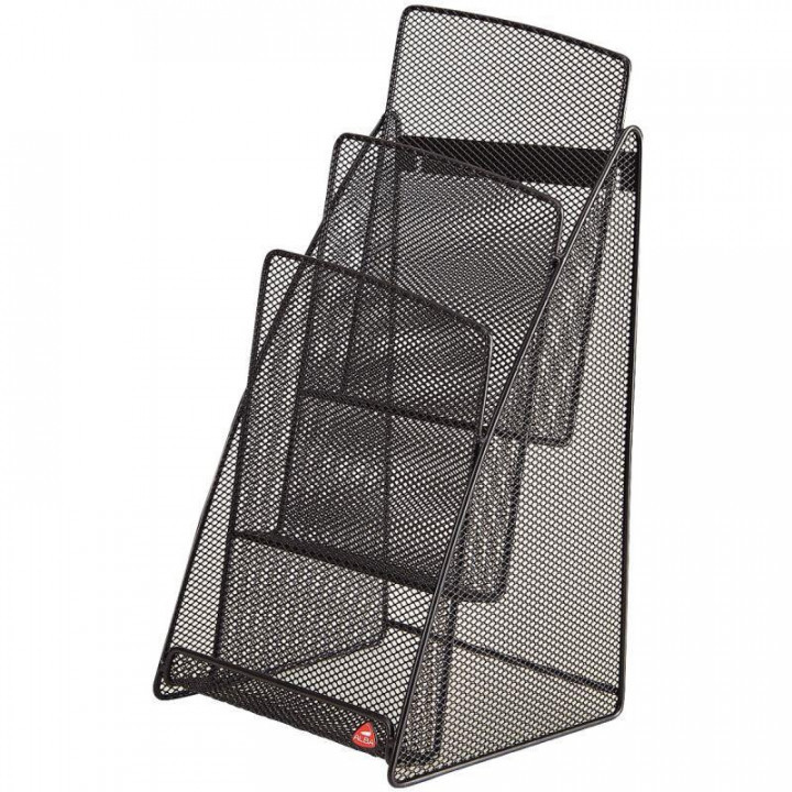 Porte-brochures 3 compartiments MESH en métal noir 148x210mm. Présentoir de table incliné pour tous vos documents jusqu'au format A5. 3 compartiments. Profondeur 3cm. Structure résistante en métal mesh pour un nettoyage facile. Garantie : 2 ans.