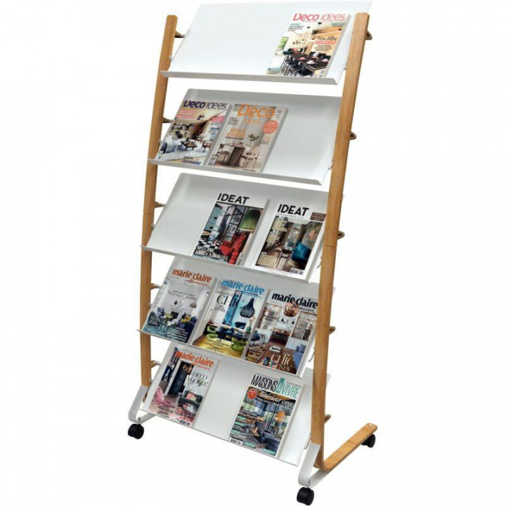 Présentoir mobile 15 compartiments blanc et bois . Combinaison bi-matière (bois FSC et ABS). 5 x 3 compartiments (24x32cm documents). 4 roulettes pour plus de mobilité dont 2 avec freins. Assemblage facile pour un montage rapide (kit d'assemblage fourni). Garantie : 2 ans.