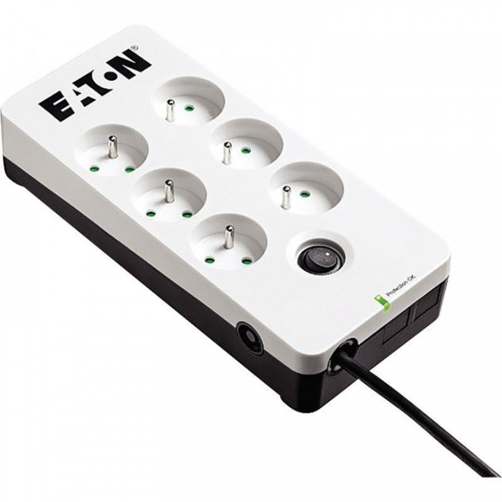Protection secteur 6 prises. Protection contres les surtensions Premium • La conception avancée de Eaton Protection Box est conforme à la norme internationale de protection contre les surtensions IEC 61643-11. • Conçu pour protéger les équipements sensibles contre les surtensions, interférences. • L’indicateur led fournit des informations sur l’état du module de surtension. Double protection • Les modèles Tel@ intègrent une connexion RJ11/xDSL pour protéger les passerelles internet des perturbations causées par la ligne de données. Chargeur USB • Les Protections Box 6 USB, 8 USB Tel@ offrent 2 ports USB (2,4 A maximum) pour charger tous types d’appareils mobiles. Fonctionnalités Premium • Pour faciliter l’installation, le montage mural est disponible sur tous les modèles. • Un disjoncteur de 10 A protège l’installation de toute surcharge. Garantie pour les équipements connectés • Eaton offre une garantie gratuite sur les équipements connectés (applicable uniquement dans les pays de l’UE et en Norvège). Le prix d’achat comprend cette garantie pour tous les produits Protection Box (jusqu’à 50 000 € pour le modèle à 8 prises), couvrant les dommages dus à la défaillance de la protection des surtensions. Protection idéale pour : • Informatique et périphériques associés. • Équipement TV/Vidéo/Hi-fi : TV, ensemble home cinéma, graveurs DVD, décodeurs numériques. • Modem Internet xDSL/TV xDSL. • Électroménager