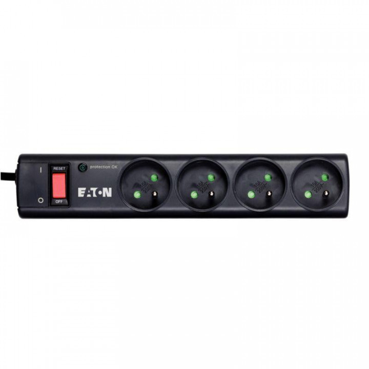 Bloc 4 Prises MGE Antifoudre. Protection-surtensions pour informatique, multimedia, téléphonie, TV/Hi-Fi/Vidéo, équipements de bureau, Technologie 3 LINE PROTECTION efficace contre tous les types de perturbations, prises avec obturateurs, témoin de protection active, bouton marche/arrêt avec disjoncteur réarmable, montage mural, garantie des matériels connectés jusqu?à 15 000 Euros.