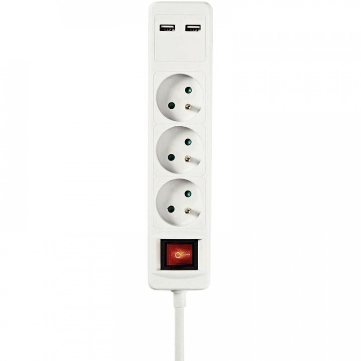 Bloc de 3 prises + 2 USB avec bouton marche/arrêt 1,5m blanc. Avec bouton marche / arrêt intégré.
