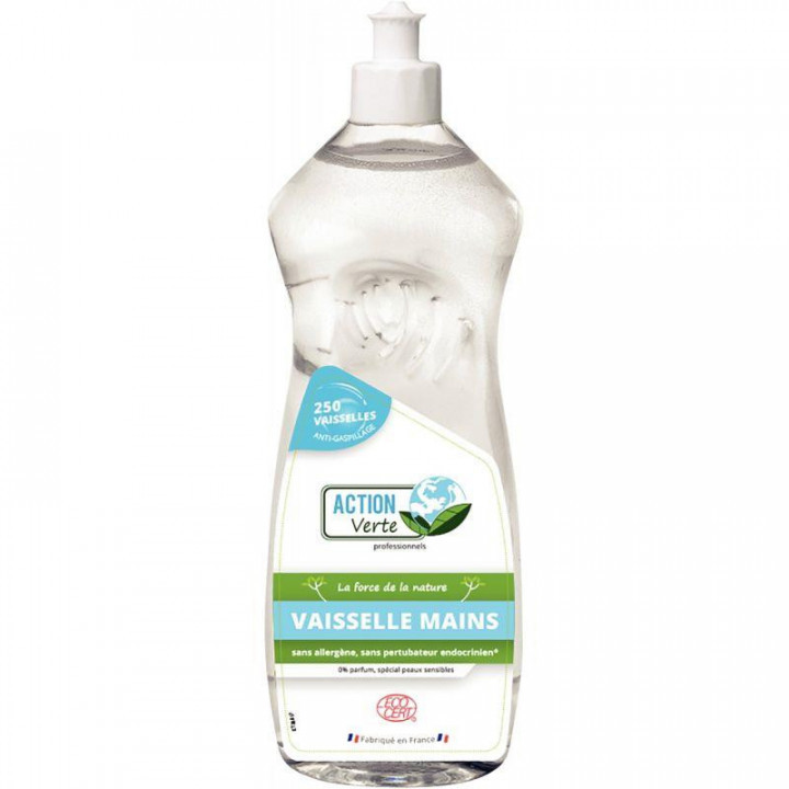 Flacon 1L liquide vaisselle mains ACTION VERTE. Formule professionnelle ultra concentrée. Nettoie, dégraisse et désincruste parfaitement la vaisselle la plus sale. Sans colorant, sans allergène, sans perturbateur endocrinien. Sans parabène, sans conservateur CIT/MIT.