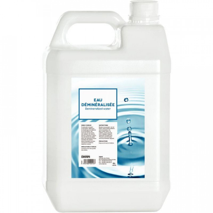 Bidon 5L eau déminéralisée. Utilisation pour le remplissage des batteries et accumulateurs, des réservoirs de lave-verres, des radiateurs de voitures, des fers à repasser à vapeur, des décolleuses de papier peint, des autoclaves et pour l'entretien des plantes. Evite la formation du tartre ainsi que les nombreux dépôts de calcaire.