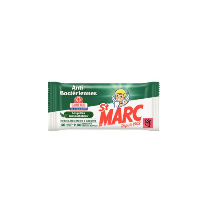 Paquet de 30 lingettes ST MARC antibactériennes. Nettoient, désinfectent et assainissent. Elimine 99,9% des bactéries en 5 minutes. Sans javel. Bactéricide EN 1276 / EN 13697. Virucide EN 14476, actif sur les virus de la Covid-19. Lingettes compostables, composées de fibres de viscose. Disparaît en moins de 42 jours de compost. 30 lingettes grand format, équivalentes à 60 lingettes classiques.