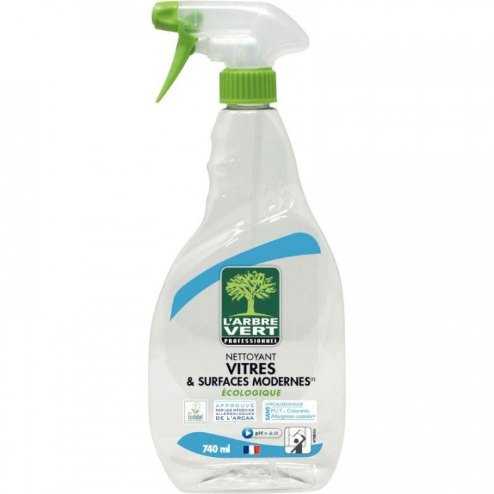 Spray 740ml ARBRE VERT nettoyant vitres . Elaboré pour l’entretien régulier des vitres, surfaces vitrées et surfaces modernes en verre (étagères, miroirs, bureaux, tables et portes…). Composition sans colorants et sans isothiazolinones ou dérivés (M.I.T.). Sans symbole de danger, ni phrase de risque. Formule non testée sur les animaux. Hypoallergénique, il a été conçu pour minimiser le risque d’allergie cutanée.