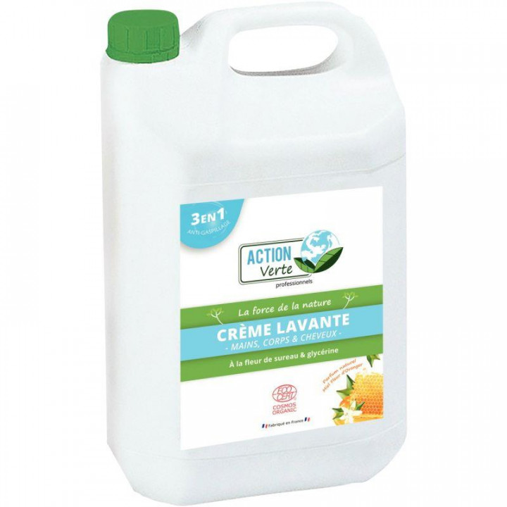 Bidon 5L crème lavante miel fleur d'oranger. 98% du total des ingrédients sont d'origine naturelle. Enrichie en glycérine et à la fleur de sureau bio, elle possède des vertus adoucissantes et laisse les mains douces. Formule non testée sur les animaux. Ph : 5,5.
