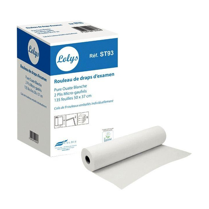 Carton de 9 rouleaux drap examen 2 plis 50x37cm. 135 feuilles micro-gaufrés. Grammage : 2 x 16 g/m². Longueur du rouleau : 49,95m. Longueur d’une feuille : 37cm Largeur d’une feuille : 50cm. Diamètre du rouleau : 130mm. Diamètre du mandrin : 51mm.