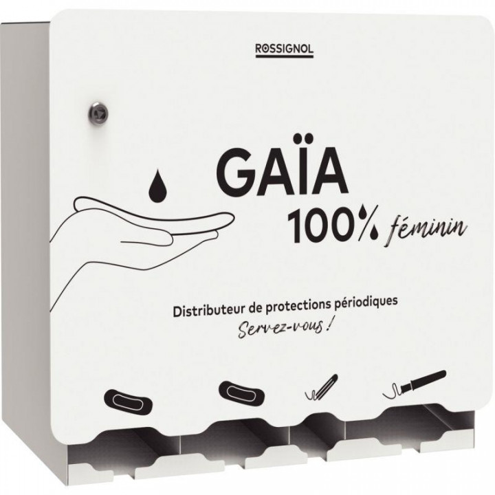 Distributeur de protections périodiques. 4 compartiments dédiés par type de consommables et indépendants les uns des autres. Capacité : 2x50 serviettes 100 tampons classiques 100 tampons avec applicateurs (livré sans consommables). Distributeur avec verrouillage par serrure à clé. Livré avec notice d'utilisation.