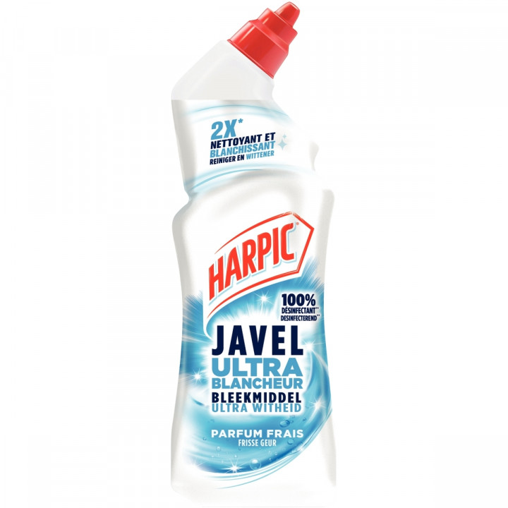 Flacon 750ml Gel WC Fraîcheur Javel. Formule 2x plus nettoyante et blanchissante. 100% désinfectant. Formule épaisse. Contient de la Javel et du bicarbonate de soude. Désodorise en laissant un parfum agréable.