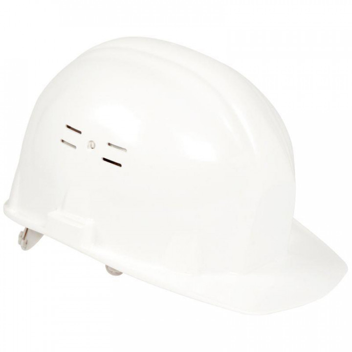 Casque de chantier blanc. Casque de chantier réglable de 2 en 2 mm. Calotte et harnais en polyéthylène. Garniture frontale 37 cm. Aération latérale. Tour de tête de 53 à 61 cm. Poids : 370g