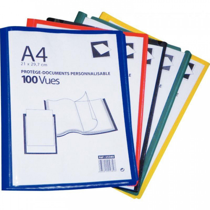 Protège-documents personnalisable 100 vues, coloris assortis. Couverture en polypropylène semi-rigide 5/10ème et pochettes en polypropylène 6/100ème antireflets et antistatiques pour format A4. Livraison selon 5 coloris disponibles : jaune, vert, rouge, noir et bleu.