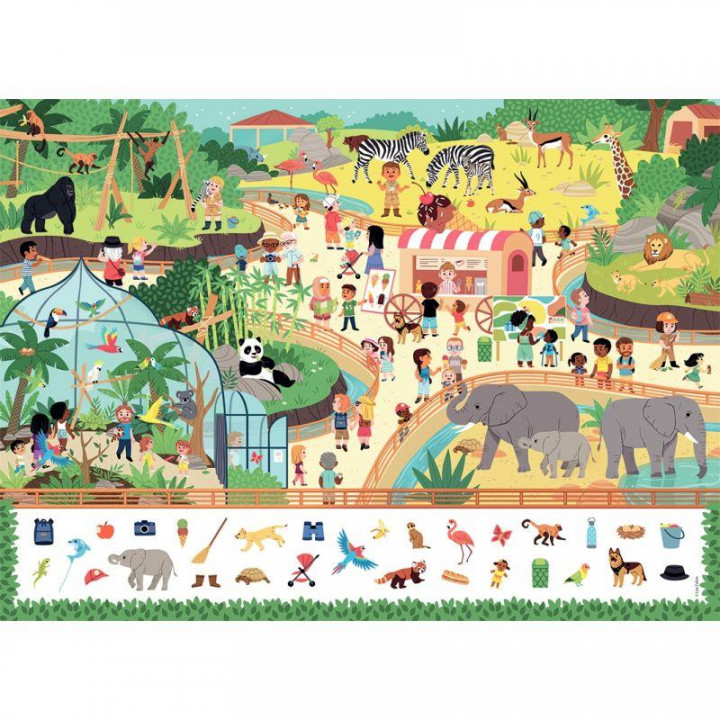 Puzzle cherche et trouve 45 pièces, le zoo. Contenu : 45 pièces en carton épais et 1 poster grandeur nature servant de modèle. Une fois assemblé, l'enfant s'amuse à retrouver les éléments cachés dans le puzzle et illustrés dans la frise ! Puzzle d'observation riche en détails et en couleurs qui développe la curiosité, la concentration et le vocabulaire des enfants. Dimensions : L.36 x l.26 cm. Dès 5 ans.