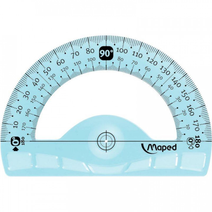 Rapporteur 180° 12cm incassable. Marquage haute qualité, toucher soft antidérapant, 100% résistant aux chocs, préhension ergonomique. Repérage optimisé du centre, signalisation du sens de lecture des graduations. Coloris assortis.