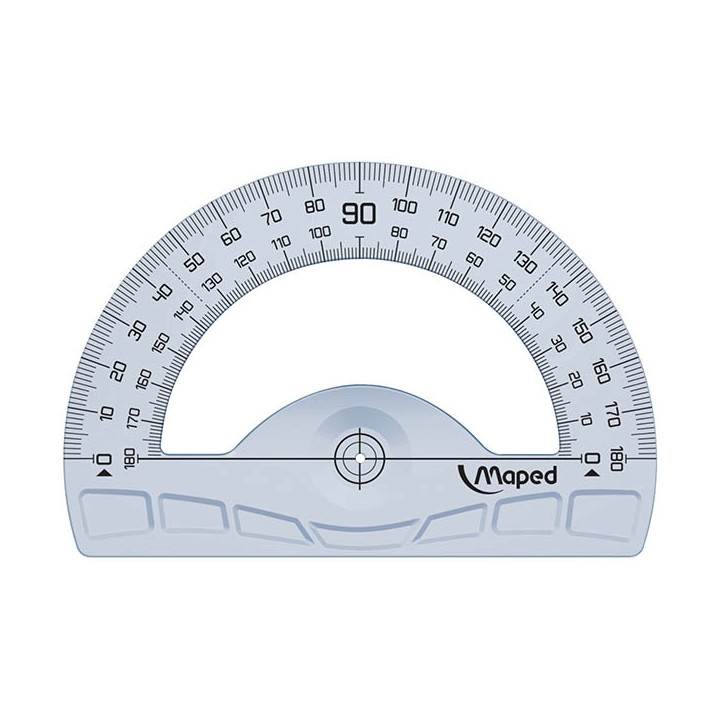 Rapporteur 180 degrés 12cm GEOMETRIC. Impression des graduations avec une encre UV pour une résistance optimale. Repérage optimisé du centre, préhension ergonomique, signalisation du sens de lecture des graduations. 80% recyclé