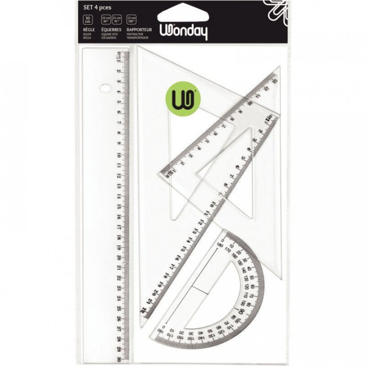 Set de 4 articles traçage économique. Comprenant 1 règle de 30 cm, 1 équerre 60°/21cm, 1 équerre 45°/21cm et un rapporteur 180°/12cm