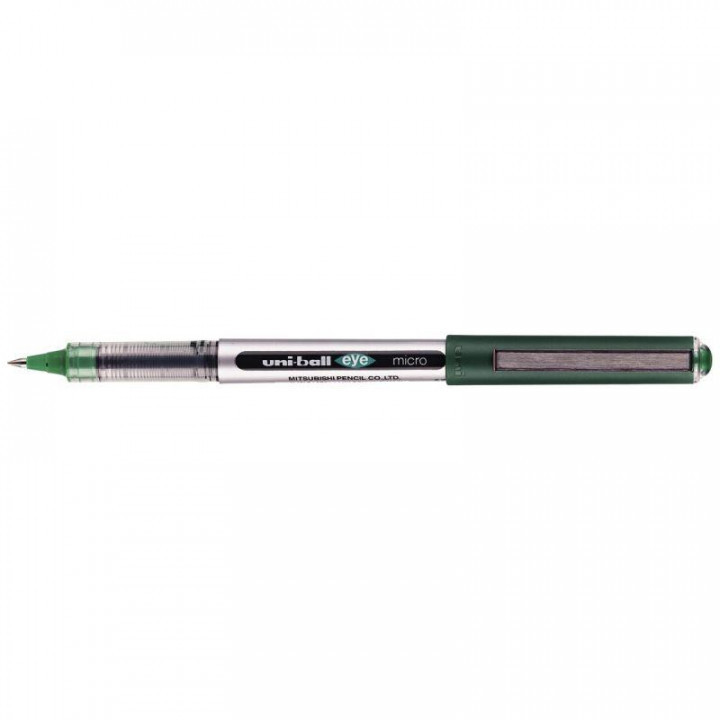 Roller Uniball Eye UB150 pointe fine vert. Encre liquide à pigmentation infalsifiable et inaltérable à l'eau et à la lumière. Niveau d'encre visible. Contrôle du débit de l'encre. Idéal pour les documents officiels.