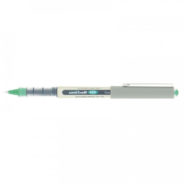 Roller Uniball Eye UB157 pointe moyenne vert. Encre liquide à pigmentation infalsifiable et inaltérable à l'eau et à la lumière. Niveau d'encre visible. Contrôle du débit de l'encre. Idéal pour les documents officiels.
