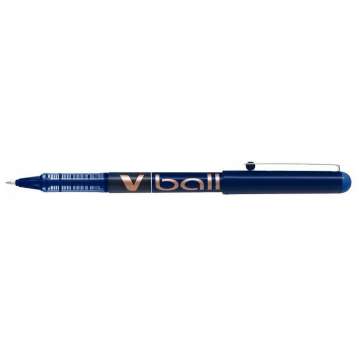 Roller V-Ball 1.0 mm bleu. Ecriture large, pointe 1 mm, tracé 0.6 mm. Roller à pointe métal conique, bille en carbure de tungstène indéformable. Encre liquide à niveau visible. Doté d'un régulateur d'encre. Clip métal sur le capuchon.