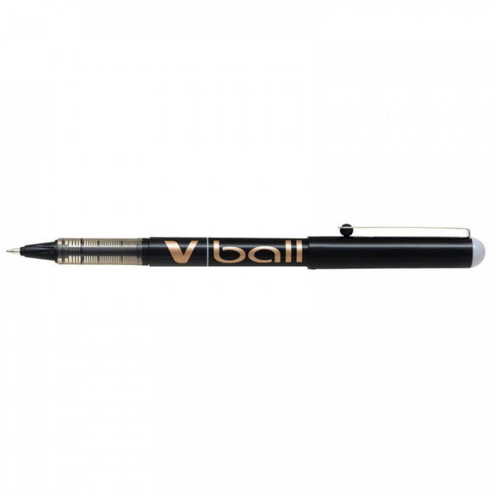 Roller V-Ball 1.0 mm noir. Ecriture large, pointe 1 mm, tracé 0.6 mm. Roller à pointe métal conique, bille en carbure de tungstène indéformable. Encre liquide à niveau visible. Doté d'un régulateur d'encre. Clip métal sur le capuchon.