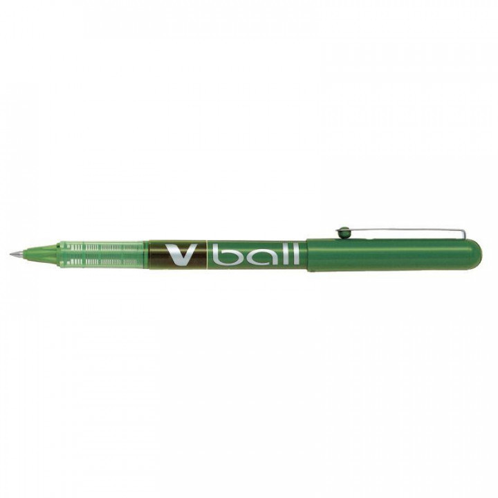 Roller V-Ball 0,5 mm vert. Ecriture fine, pointe 0.5 mm, tracé 0.3 mm. Roller à pointe métal conique, bille en carbure de tungstène indéformable. Encre liquide à niveau visible. Doté d'un régulateur d'encre. Clip métal sur le capuchon.