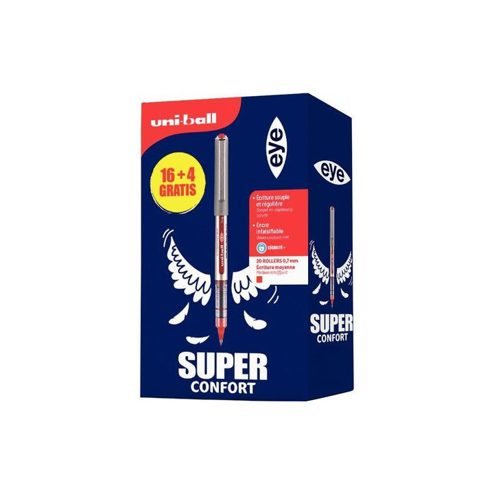 Boîte de 20 rollers UB157 pointe moyenne rouges dont 4 gratuits. Encre liquide à pigmentation infalsifiable et inaltérable à l'eau et à la lumière. Niveau d'encre visible. Contrôle du débit de l'encre. Idéal pour les documents officiels.