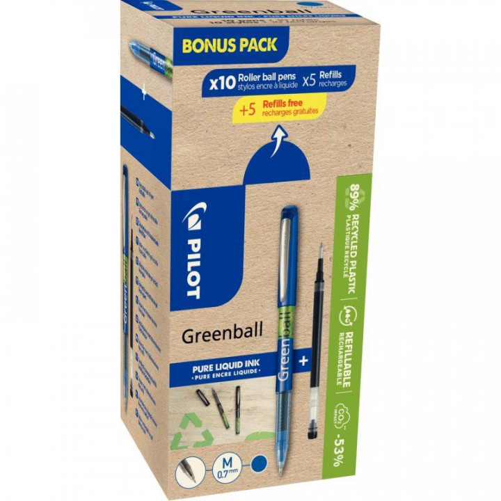 Greenpack de 10 rollers Greenball bleus + 10 recharges. Roller à pointe métal encre liquide à niveau visible Gamme Begreen. Pointe 0,7mm.