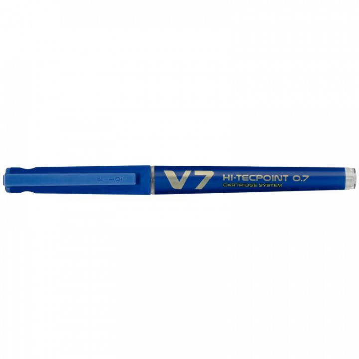 Roller V7 rechargeable bleu. Encre liquide et niveau visible. Régulateur d'encre. Pointe Hi-Tec sertie en 3 points. Pointe 0.7mm Tracé : 0,5mm