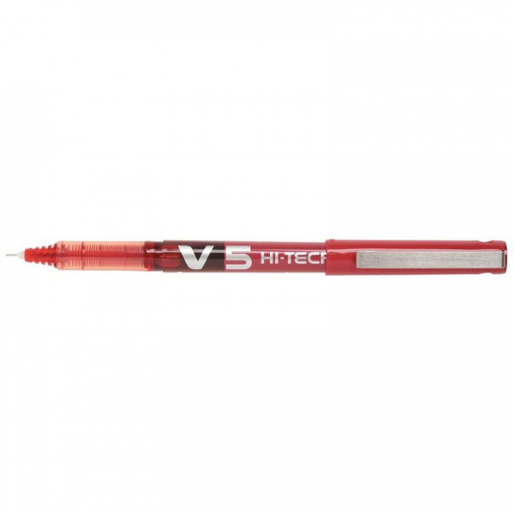 Roller V5 rouge. Ecriture fine, pointe aiguille 0.5 mm, tracé 0.3 mm. Encre liquide, niveau d'encre visible. Doté d'un régulateur d'encre. Clip métal sur le capuchon.