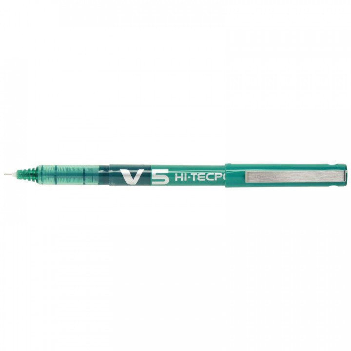 Roller V5 vert. Ecriture fine, pointe aiguille 0.5 mm, tracé 0.3 mm. Encre liquide, niveau d'encre visible. Doté d'un régulateur d'encre. Clip métal sur le capuchon.