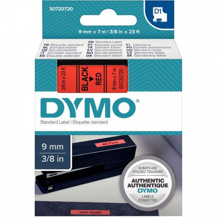 Recharge DYMO D1 9 mm x 7 m noir et rouge. Système D1 a mono-cassette pour modèles : 1000 / 1000+ / 2000 / 3500 / 4500 / 5500 / LP 100 / LP 200 / LP 300 / LM 100 / LM100+ / LM 150 / LM 200 / LM300 / LM 350 / LM400 / LM PC / Pocket.Ruban encreur et ruban support associés offrent une totale facilité d'utilisation du système. Support plastique. Les étiquettes imprimées s'utilisent toutes de la même façon. Elles adhèrent sur la plupart des surface propres et planes ( papier, plastique, métal, bois, verre ).Résistantes à l'eau, au pétrole et aux graisses de même qu'à la plupart des solvant doux.Elles résistent également aux températures situées entre - 30° et + 150°C.