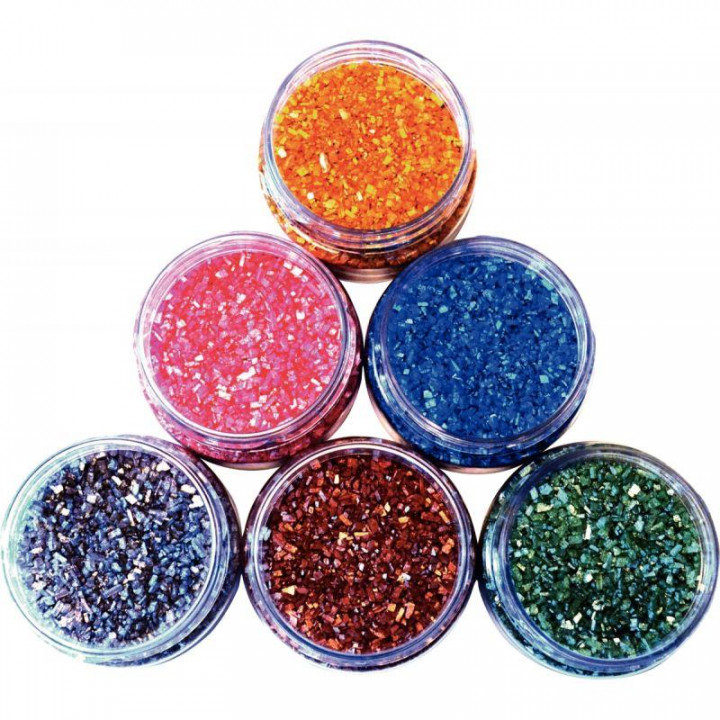 Lot de 6 salières de 150 grammes de cristaux de pierre nacrés. Couleurs : or, argent, cuivre, bleu, vert et rose. Salière à 3 débits. Pour des réalisations étincelantes.