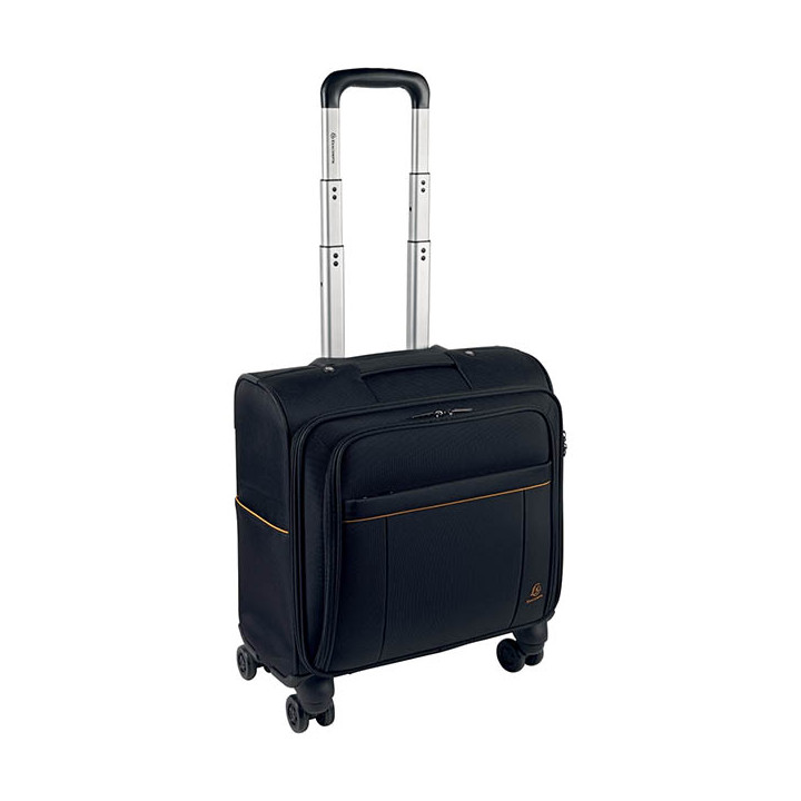 Trolley Exactive pour ordinateur portable jusqu'à 15,6". Coloris noir, intérieur jaune. En polyester. Polyester. Grande poche zippée à l’avant avec de nombreux compartiments ouverts ou fermés pour ordinateur portable 15.6’’, tablette, téléphone, stylo, pouvant être sécurisé grâce au cadenas à combinaison TSA. Port USB intégré. Compatible bagage à main la plupart des compagnies aériennes. Poignet de transport télescopique. Dimension roulettes comprises : L42 x H48 x I23 cm Poids : 3,7 kg.