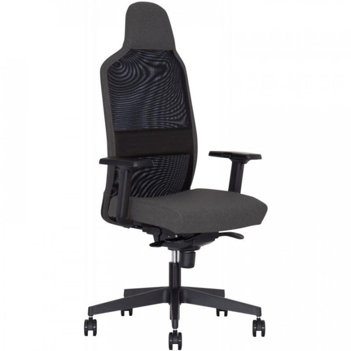 Fauteuil Cool On dossier noir/assise gris. Maxi dossier (têtière intégrée) à mécanisme synchrone FS, assise tapissée, dossier résille. Assise : structure hêtre multipli 7 couches / 10,5 mm, mousse épaisseur 50 mm densité 45 kg/m3. Dossier : cadre en polypropylène, avec bordures du cadre et têtière tapissées en tissu assorti à l’assise. Partie centrale du dossier en résille polyester. Tissu assise 100% polyester / classé non feu EN1021.1 et 2 + M1. Piètement 5 branches polypropylène injecté. Roulettes auto-freinées Ø 65 mm pour moquette. Assise réglable en hauteur par vérin oléopneumatique. Réglage de la tension de dossier en fonction du poids de l’utilisateur. Blocage du dossier / 5 positions. Système de sécurité anti-retour lors du déblocage du dossier. Accoudoirs inclus : 2D (hauteur sur 75 mm et largeur 50 mm) support en nylon et manchettes en PU « soft touch ». Garantie 5 ans.