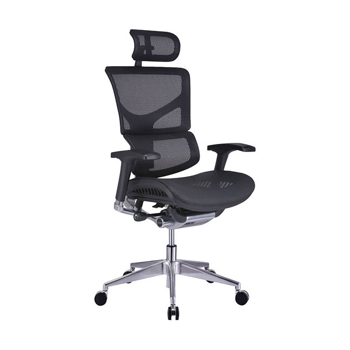 Siège MEMPHIS avec tétière noir. Mécanisme synchrone dynamique haut de gamme. Dossier en deux parties avec ajustement automatique de l’angle de la partie inférieure pour un soutien optimisé des lombaires.�Dossier, assise et têtière en résille polyester haute qualité noire sur cadre polypropylène injecté.�Dossier complet réglable en hauteur sur 60 mm par crémaillère et blocable sur 4 hauteurs. Le dossier redescend au plus bas une fois la position la plus haute atteinte. Dossier: H58 x L52 cm. Assise: L54 x P46 cm + glissière 5 cm. Hauteur d’assise réglable de 41 à 50 cm. Structure mécanique et bras de dossier : fonte d’aluminium poli.�Piétement en fonte aluminium poli aspect chrome.�Roulettes: Ø 65mm, auto-freinées, polyvalentes sol moquette. Têtière réglable 2D ajustable en hauteur sur 70 mm et en inclinaison sur 80°. Accoudoirs réglables 4D en hauteur (90 mm – 9 positions) avec manchettes pivotantes sur 18° et coulissantes avant/arrière sur 55 mm. Manchettes réglables en largeur sur 30 mm chacune. Pour utilisateur jusqu’à 125kg. Garantie 7 ans.