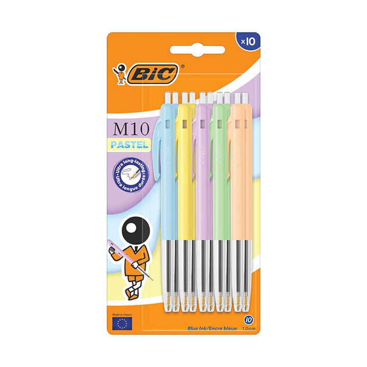 Blister de 10 stylos bille M10 pastel assortis. Ecriture moyenne : pointe 1mm, tracé 0,4mm. Encre bleue, coloris pastel assortis : jaune, bleu, violet, vert, orange. Rétractable.