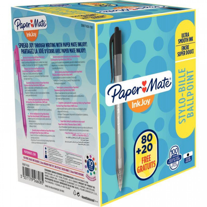 Boîte de 100 stylos Inkjoy 100 rétractable noirs dont 20 gratuits. Il dispose d'un design moderne et surtout un nouveau système d'écriture surprenant. Ce système d'écriture offre une douceur d'écriture incroyable. Le stylo glisse littéralement sur le papier et son encre à séchage rapide évite toute les bavures. Il procure des couleurs vives et intenses qui éclaireront vos lignes, page après page.