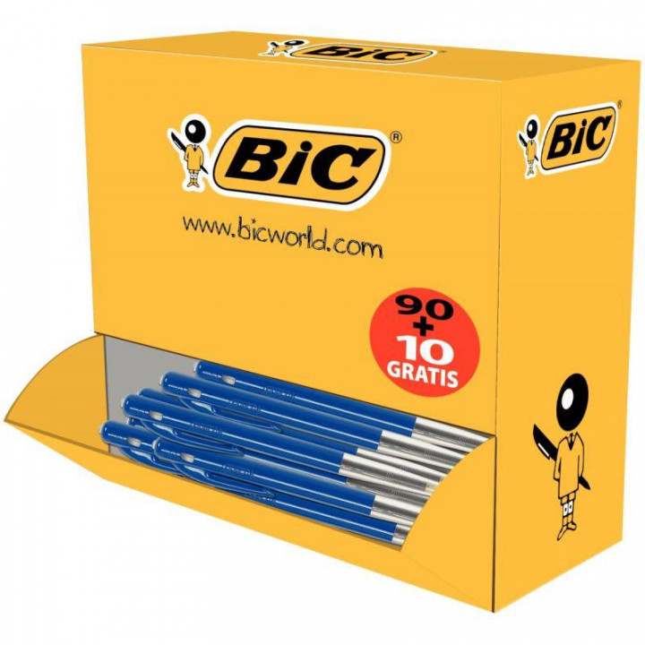 Boîte de 100 stylos bille M10 bleus dont 10 gratuits. Corps avec agrafe à la couleur de l'encre.