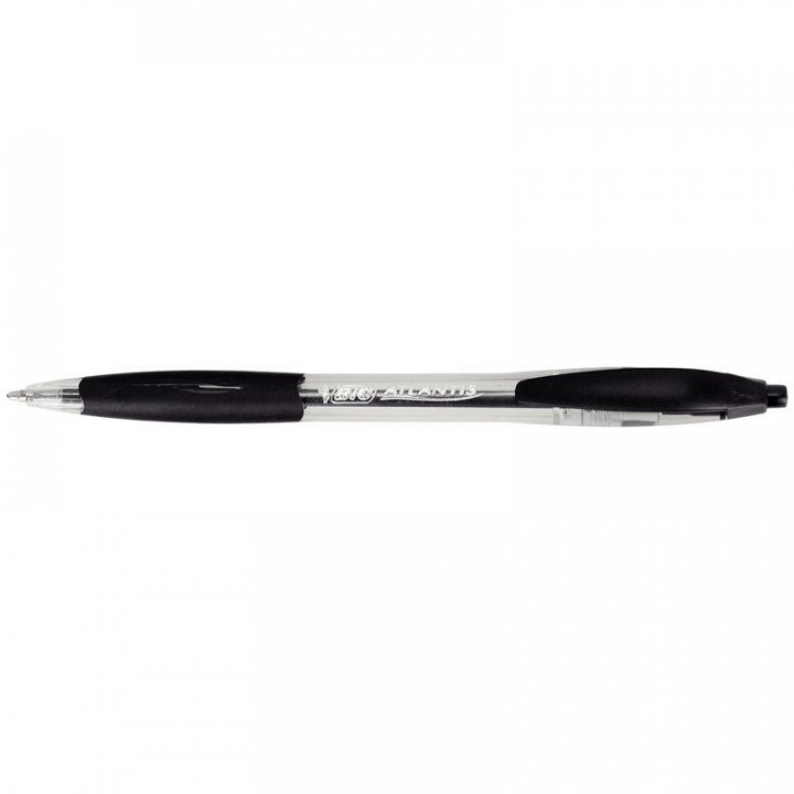 Stylo Atlantis rétractable noir. Stylo bille offrant une grande souplesse d'écriture et doté d'un design élégant. Technologie d'encre ultra glissante et douce pour une facilité d'écriture. Confort anti glisse grâce à son grip caoutchouc.