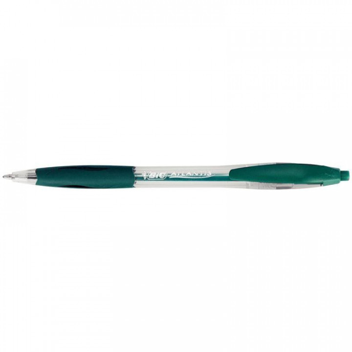 Stylo Atlantis rétractable vert. Stylo bille offrant une grande souplesse d'écriture et doté d'un design élégant. Technologie d'encre ultra glissante et douce pour une facilité d'écriture. Confort anti glisse grâce à son grip caoutchouc.