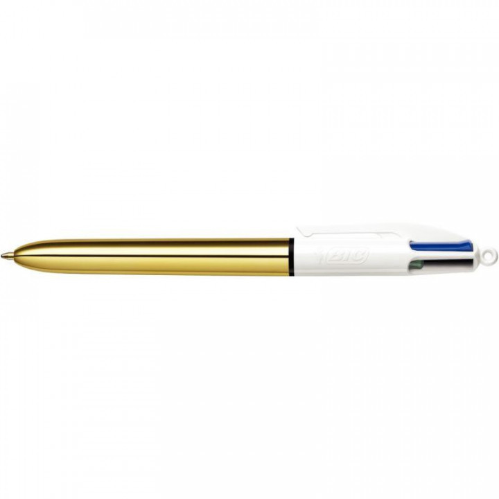 Stylo bille 4 Couleurs Shine or. Le stylo 4 Couleurs Shine se pare d'un revêtement brillant, moderne et métallique. Il a 4 pointes moyennes de 1.0mm (bleu, noir, rouge, vert) convenant à tout type d'usage : écrire, dessiner, organiser ses notes. Grâce à son bouton poussoir, changez de couleur en un clic sans jamais changer de stylo, celui écrit longtemps avec 8 000 m d'écriture.