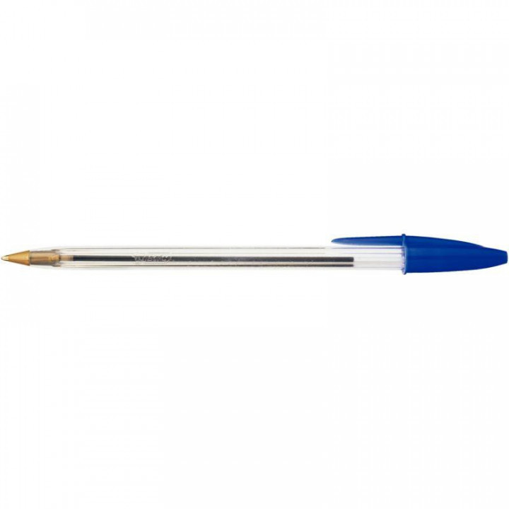 Stylo bille Cristal pointe moyenne bleu. Corps cristal transparent, capuchon ventilé et clip à la couleur de l'encre.