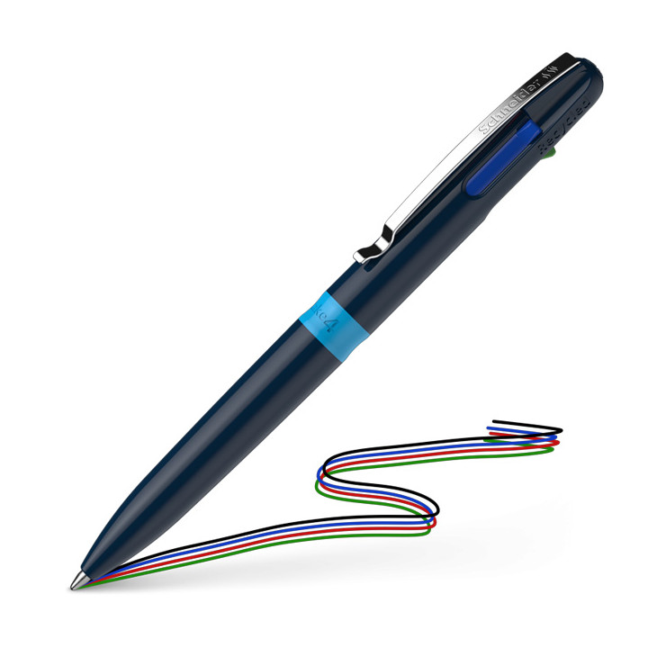 Stylo bille 4 couleurs pointe moyenne Take 4. Ecriture moyenne, pointe 1 mm, tracé 0,5 mm. La technologie Viscoglide® assure une écriture douce et fluide. Encre indélébile norme ISO 12757-2. Clip métal.