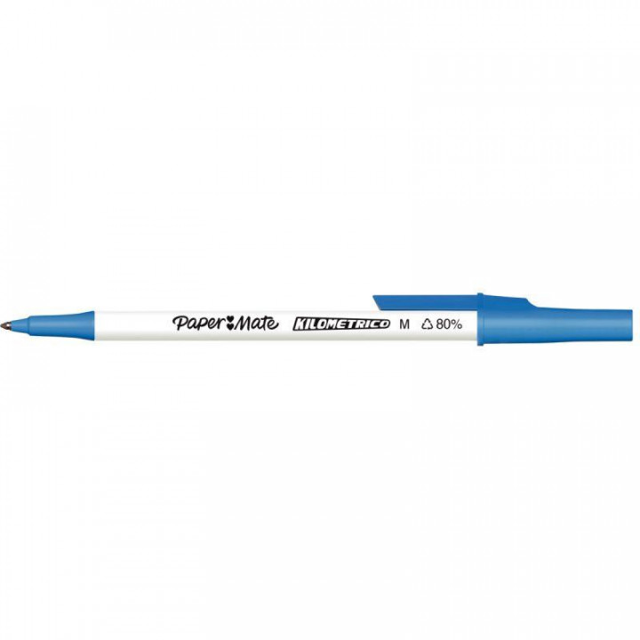 Stylo bille Kilométrico bleu. Ecriture moyenne, pointe 1mm, tracé 0,7mm.