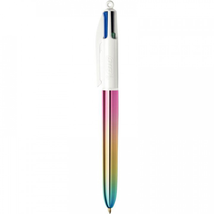 Stylo bille 4 Couleurs Gradient rose clair. Ecriture moyenne, pointe 1mm, tracé 0,3mm. rechargeable et rétractable. Corps métallisé avec un effet irisé/dégradé. Encre bleue, rouge, verte et noire.