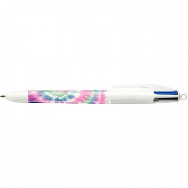 Stylo bille 4 couleurs Tie and Dye. Ecriture moyenne, pointe 1mm, tracé 0,3mm. rechargeable et rétractable. Corps Tie and Dye.