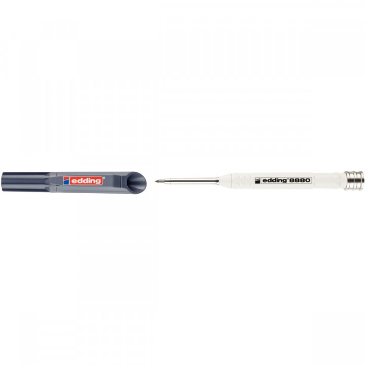 Porte-mine de chantier télescopique. Crayon de chantier porte-mine de précision avec étui pratique pour un marquage précis sur presque tous les matériaux tels que le bois, le métal, le plastique, le carrelage et le carton. Tige en aluminium extra-robuste fabriquée à partir de matériaux recyclés. Grâce à son embout long (42 mm) et fin (5,5 mm), Taille-mine intégré à l'étui. Mine remplaçable d'un diamètre de 2,8 mm. Produit prêt à l'emploi, mine de graphite universelle incluse. Rechargeable avec les mines de rechange edding 8881 en graphite et aux couleurs assorties, disponibles séparément (set de 6) pour une grande variété de surfaces.